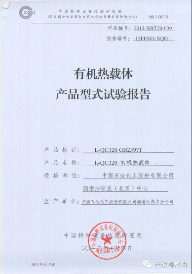 第三,選擇導(dǎo)熱油要看油品的質(zhì)量,只有通過國標(biāo)要求的產(chǎn)品才是合格產(chǎn)品,國內(nèi)導(dǎo)熱油的權(quán)威評定機構(gòu)為中國鍋爐水處理協(xié)會,為符合國家標(biāo)準(zhǔn)的產(chǎn)品提供產(chǎn)品認(rèn)可證書,如長城L-QC320礦物油型導(dǎo)熱油型式試驗證書如下: